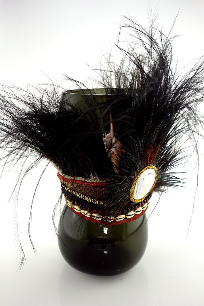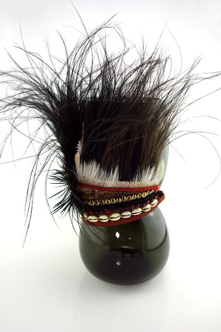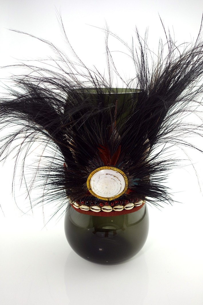 | Composition | Verre Soufflé - Coiffe Papou -Textile, Plumes, Cauris, Graines - 21e |